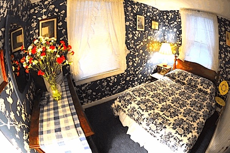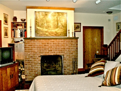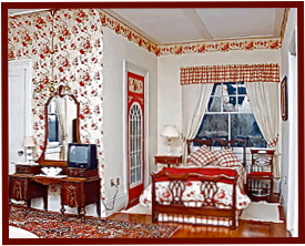 Mr. Whistler’s Room - This spacious and comfortable room reflects the taste and culture of a well-to-do country gentleman. It features a wood-burning fireplace, a tapestry and original etchings and prints. The bathroom has an oversized bath tub and an antique “water closet.”
