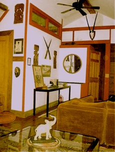 The spacious African Room is located in the coach house. The furnishings are influenced by the love that the Mears family has for Africa. It is filled with artifacts from their many safaris to Kenya, Botswana, Zambia, Namibia and Zimbabwe. There is a king-sized bed, a private bathroom, a sitting area with a pull-out queen-sized bed, a dining table with chairs, and a large collection of books. This room is located upstairs.