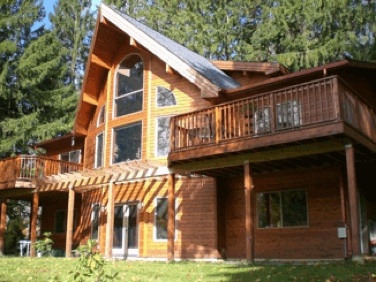 The Evergreen Room is located in a cedar wood house next to the coach house. This unique room has a view through glass French doors of a maze and the adjacent forest. An antique piano, a working fireplace and a modern bathroom with glass sinks and a walk-in shower are unique to the room. HDTV and internet access are available.