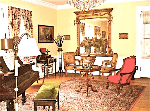Louis XVI palace furniture and mirrors, French candelabras and putti, an Austrian crystal chandelier, and numerous Persian rugs grace the music salon. Original oil paintings, some painted by Joan and Lisa Mears, and rare etchings and prints hang from the ivory walls. However, the dominant feature is the 1898 Steinway grand piano, where guests and visiting musicians often give impromptu concerts. The room has a white marble fireplace and velveteen sofas, where guests often sip complementary sherry and listen to classical music under the sparkling crystal chandelier.